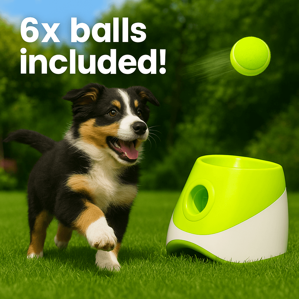 The automatic ball launcher comes with 6x balls and a USB cable to charge the device!